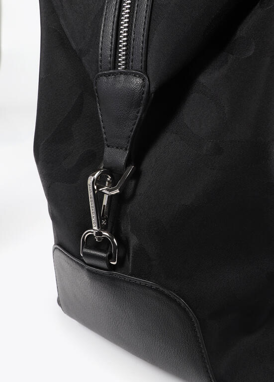 Bolsa de viaje confeccionada en nylon jacquard con estampado camuflaje. Diseño resistente y espacioso, ideal para escapadas. Asa doble y correa ajustable. Detalle de logotipo grabado.