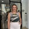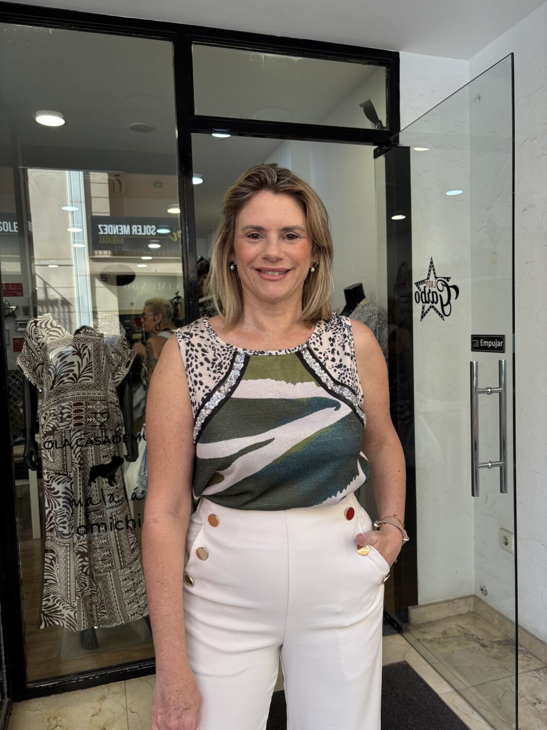 Camiseta desmangada con estampado abstracto y una sutil aplicación de lentejuela y canutillos con perla blanca.