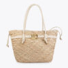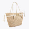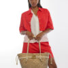 Elegante capazo de rafia con asas largas y detalles de efecto piel. Equipado con cierre ajustable y un forro de tela interior. Ideal para llevar tus pertenencias con estilo en tus salidas urbanas o a la playa.
