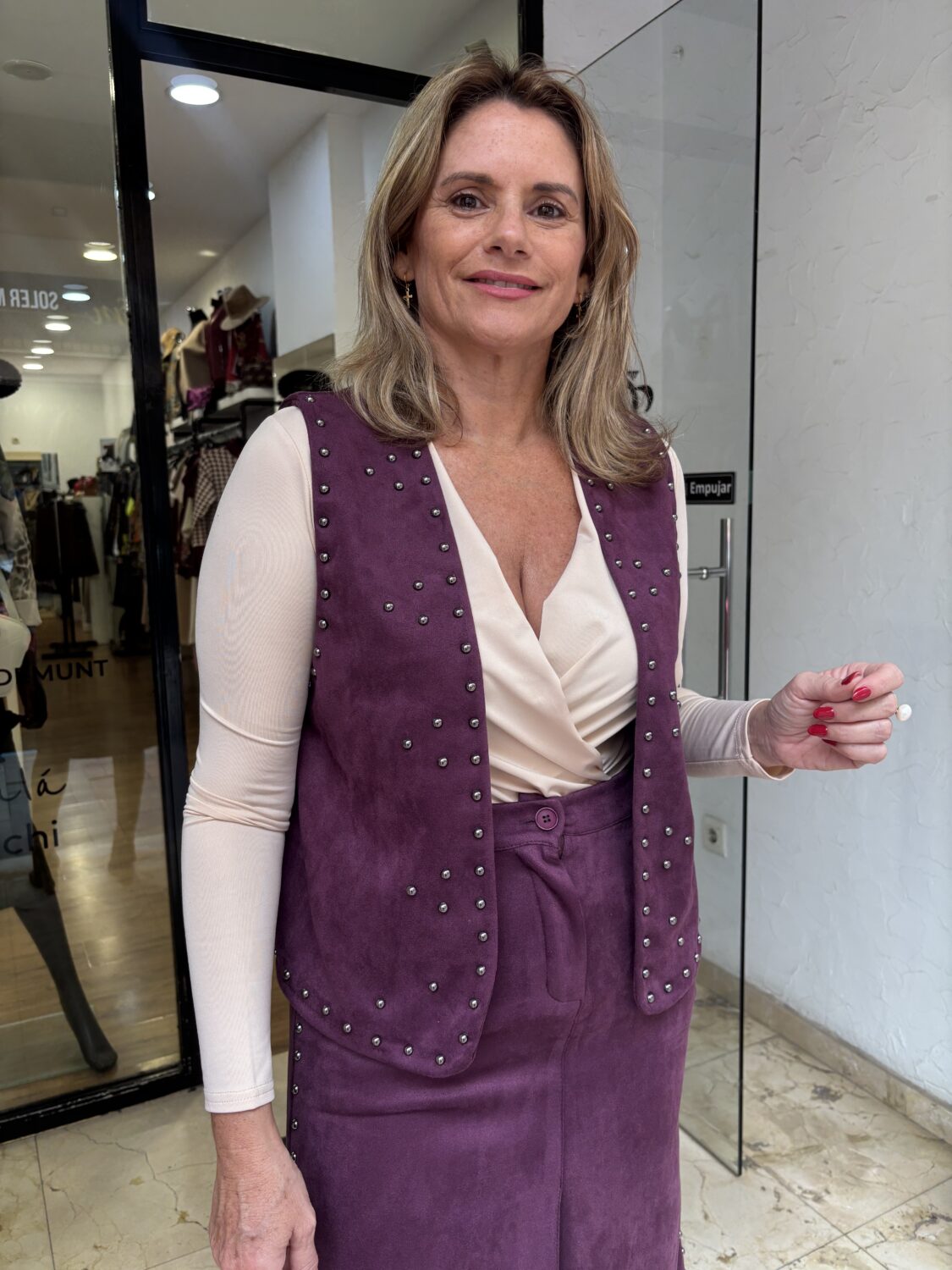 Conjunto de antelina compuesto de chaleco perfilado por la parte delantera con tachuelas plateadas.