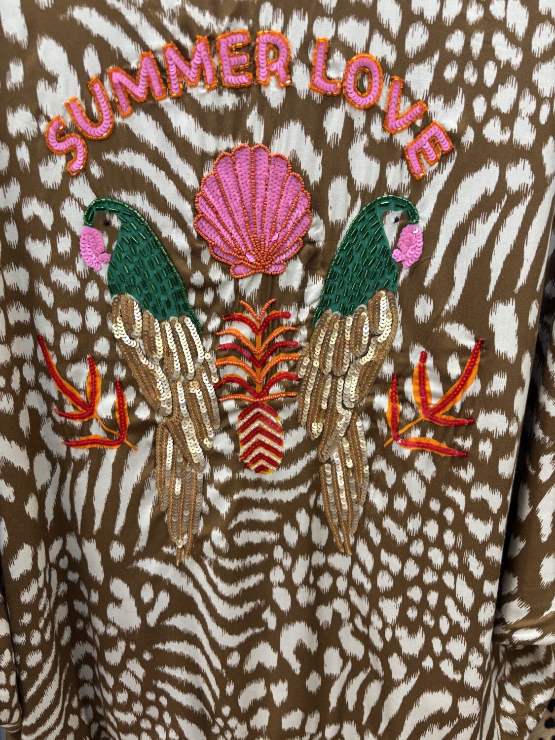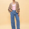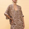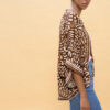 Kimono fluido con un estampado de manchas marrones sobre fondo beige. Ideal para entretiempo, con mangas amplias y detalle ribeteado. Perfecto para dar un toque bohemio a cualquier look.