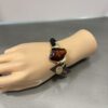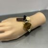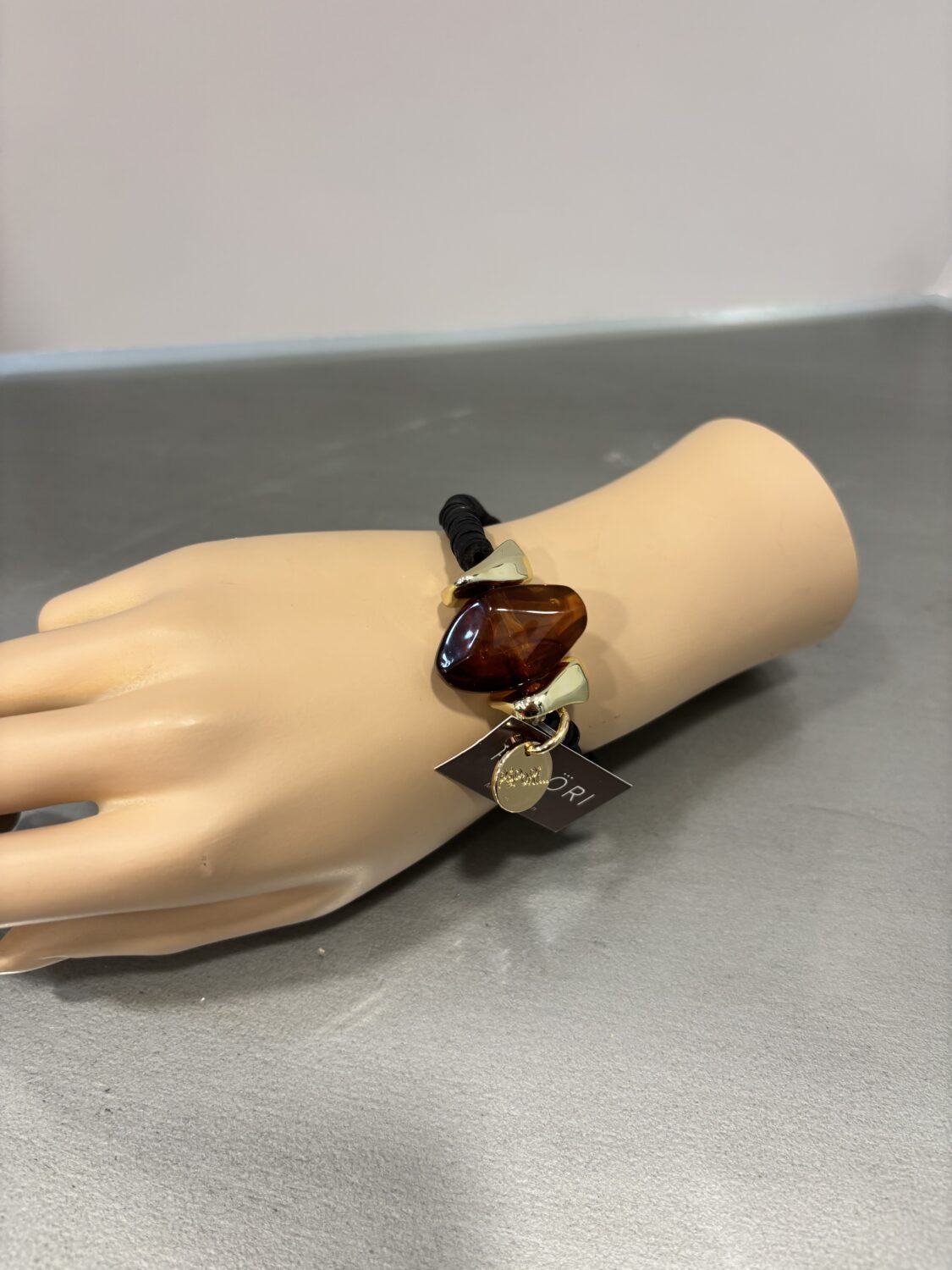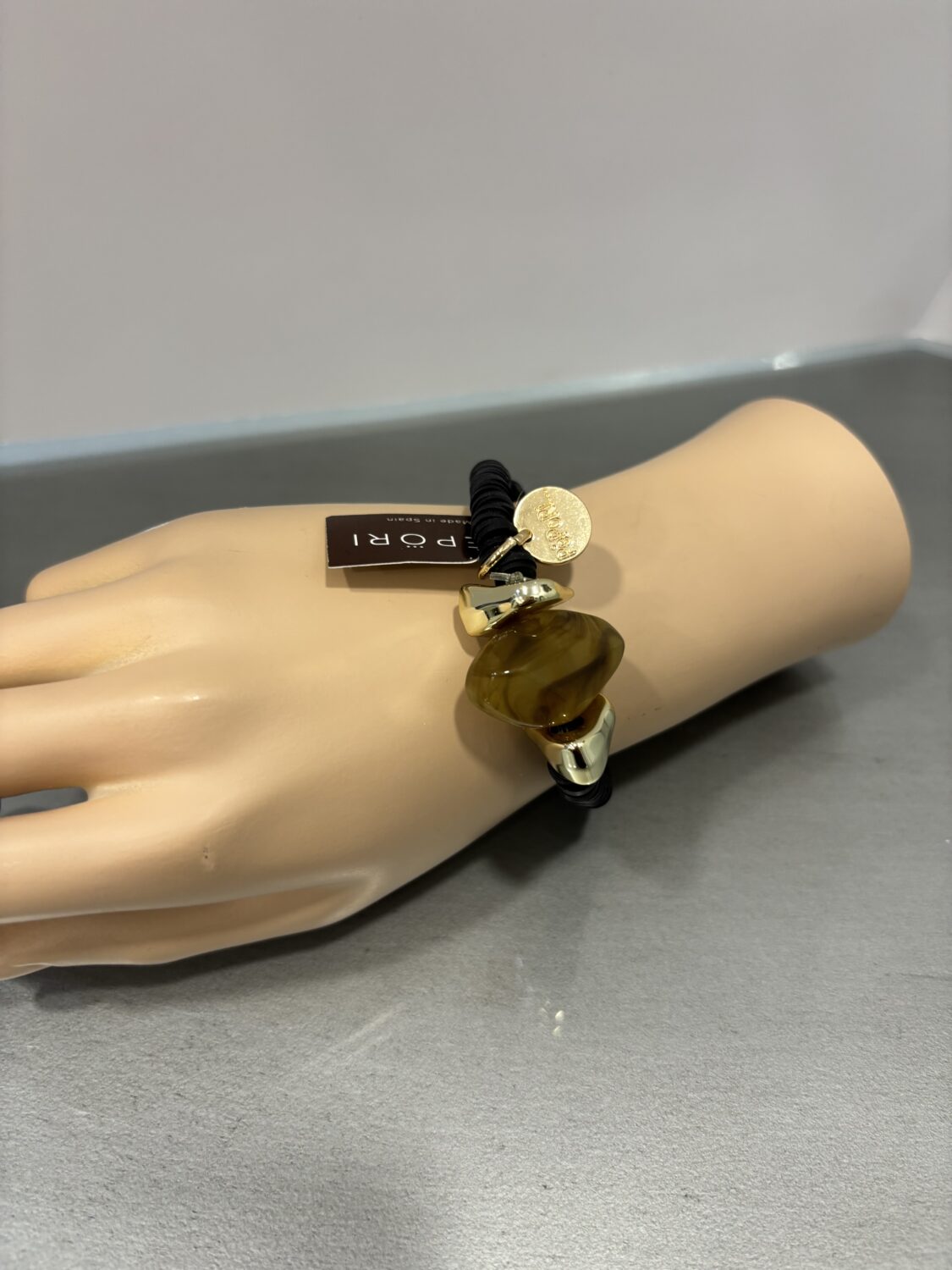 Pulsera elástica con cordón negro y pieza central en resina con reflejos naturales, acompañada de detalles dorados.