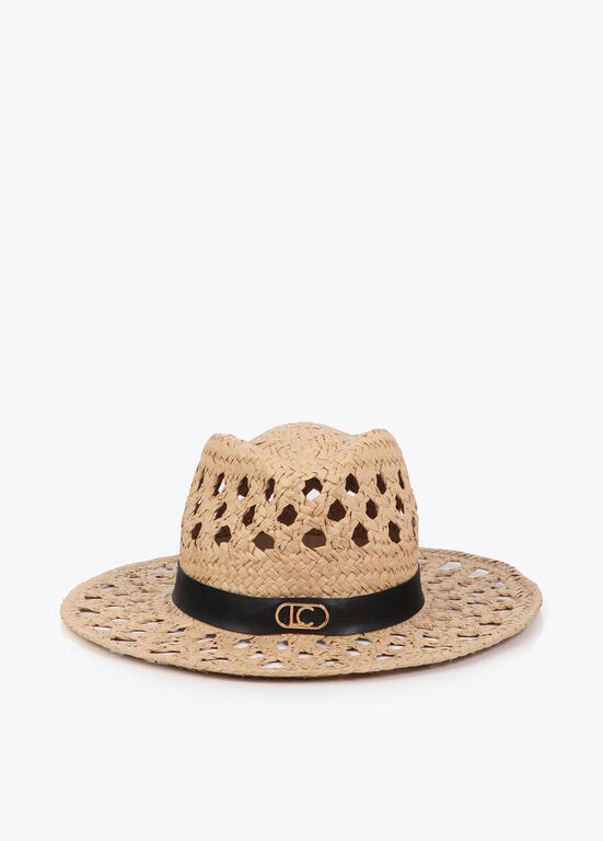 Sombrero perforado con tira personalizada en color negro y logo dorado.