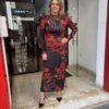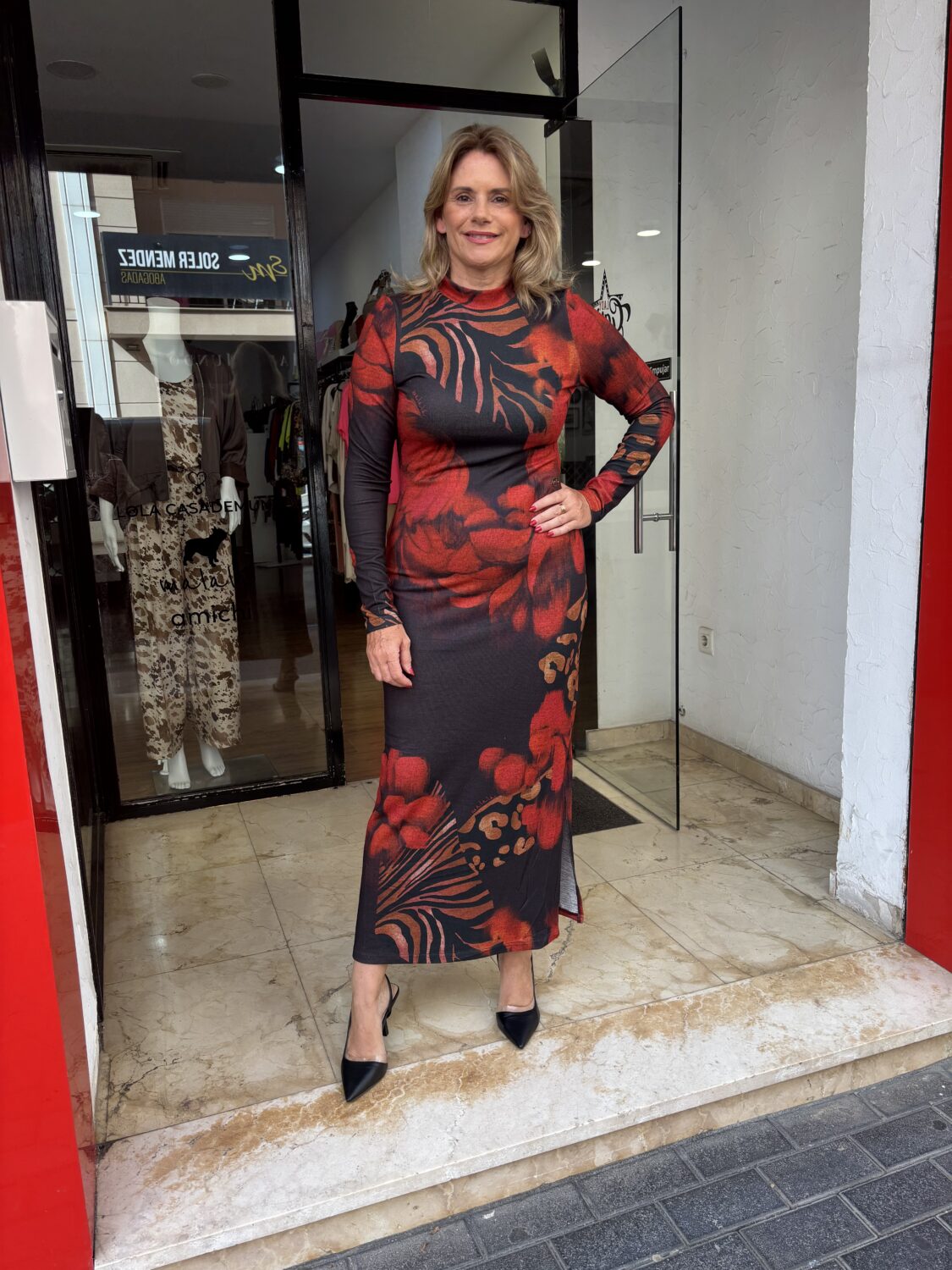 Vestido midi manga larga con estampado floral en tonos rojos y anaranjados sobre fondo negro.